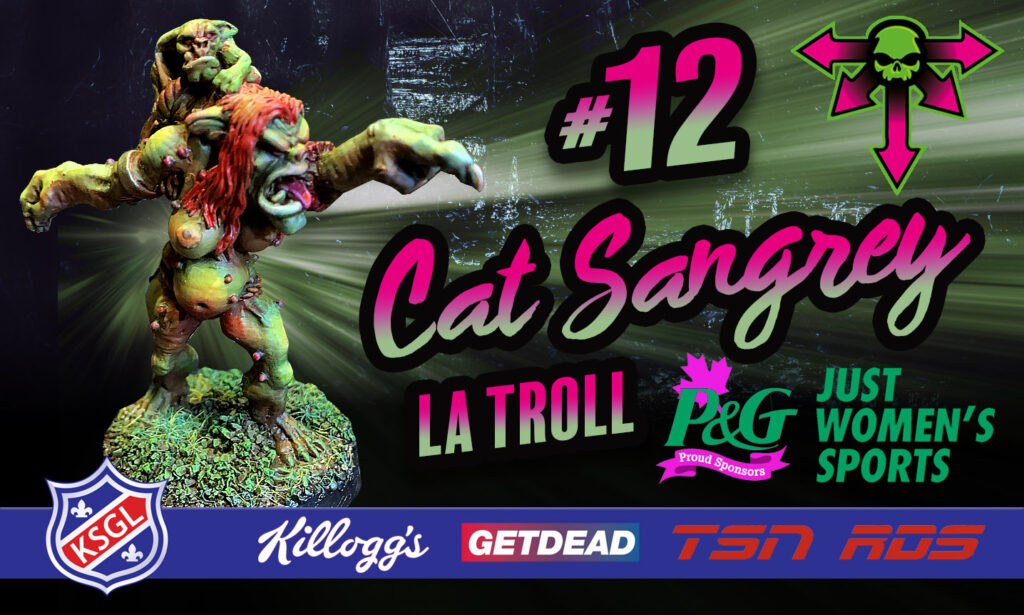 Cat Sangrey #12 nouvelle recrue pour les Ténèbres. Un être solitaire, bestiale et monstrueusement laide, vêtus de haillons. Malgré sont air stupide, elle semble pourvu d’exceptionnelle capacité de régénération qui lui permettera de survivre à presque n’importe quelle blessure. De longs bras griffus qui pendent presque jusqu’à terre. Sa tête est aplatie et avec de grosse lèvres protubérantes. Et avec un semblant de trouble gastrique qui lui occasionne de sévère crise de reflux, au point d’en mettre partout. C’est pas beau à voir, une troll qui vomi dans le vestiaire, vaut mieux que ce soit sur le terrain… Et juste à temps pour le Jamboree du 26 novembre…