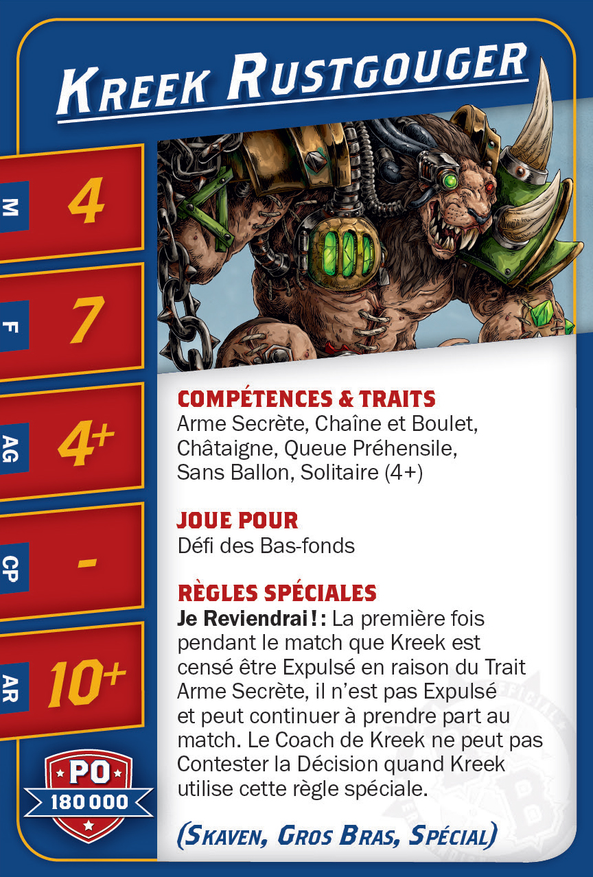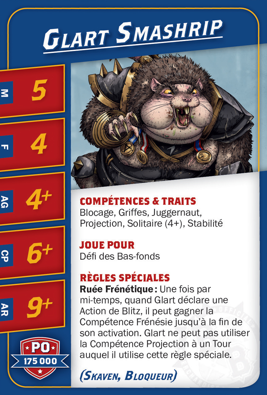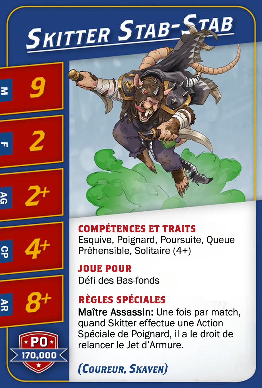 | 0-1 | Skaven Blitzer (Blitzer, Skaven) | 90,000 | 8 | 3 | 3+ | 4+ | 9+ | Animosité (Gobelin), Arracher le Ballon, Blocage | GMS | AD | 9 |