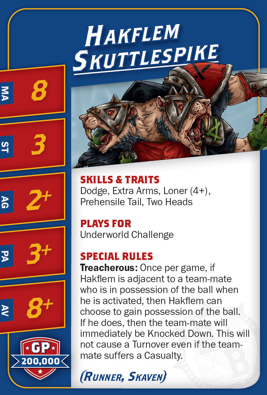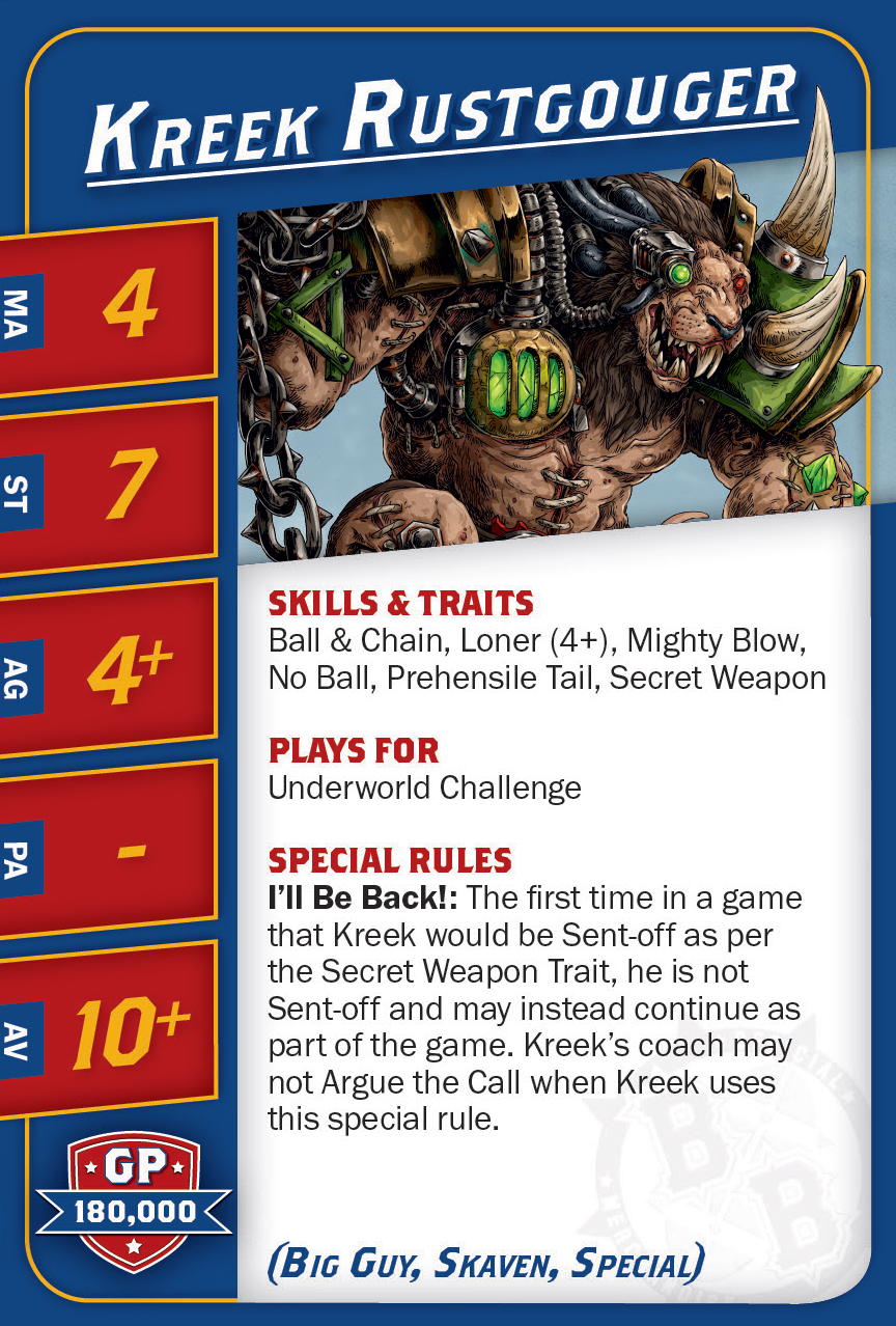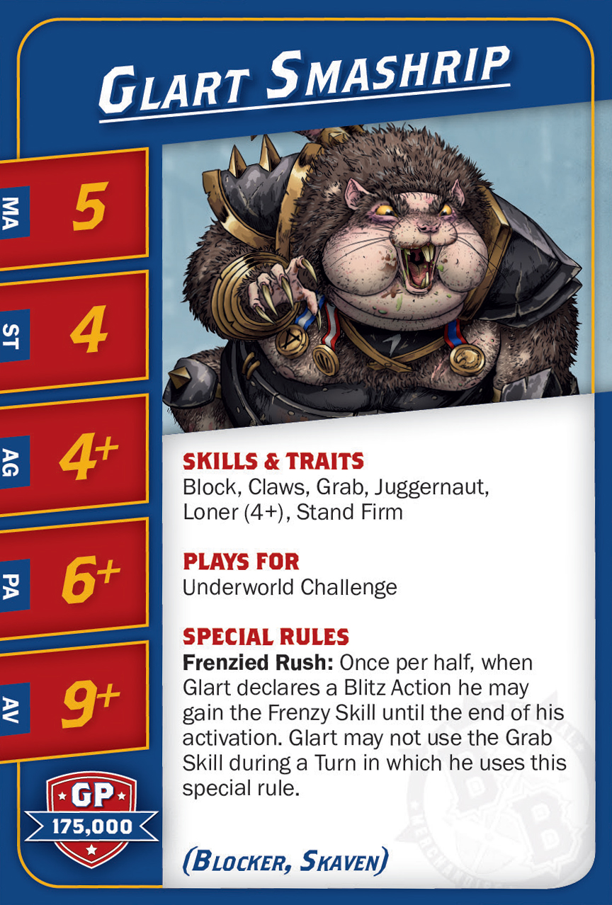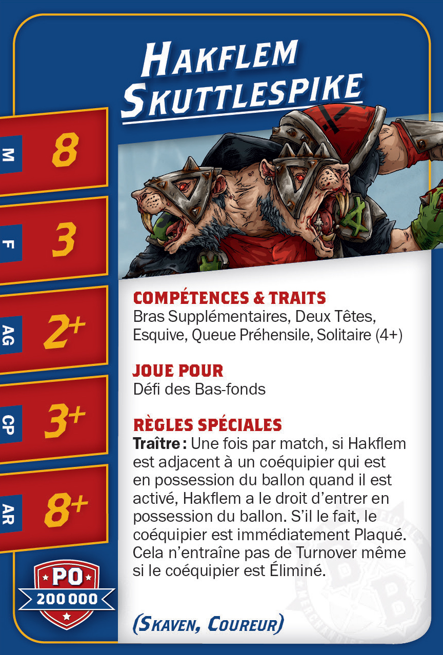 | 0-1 | Skaven Blitzer (Blitzer, Skaven) | 90,000 | 8 | 3 | 3+ | 4+ | 9+ | Animosité (Gobelin), Arracher le Ballon, Blocage | GMS | AD | 9 |