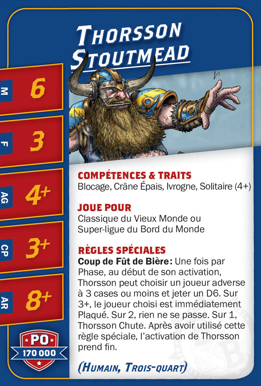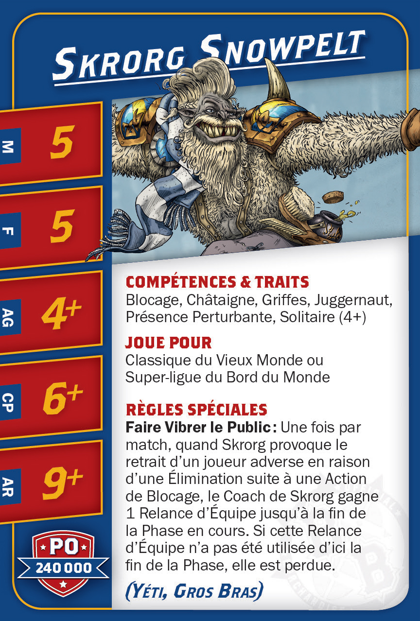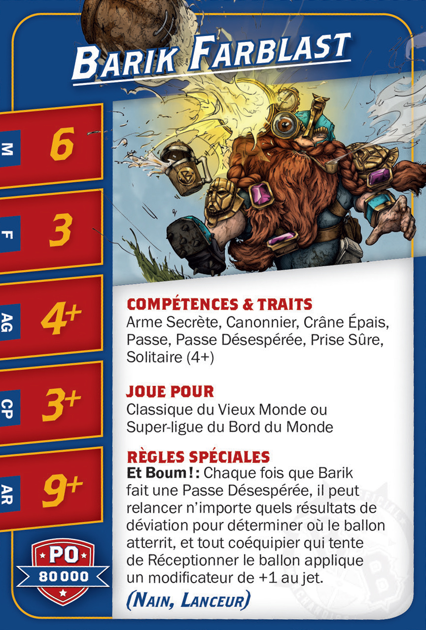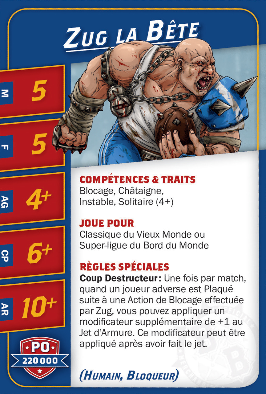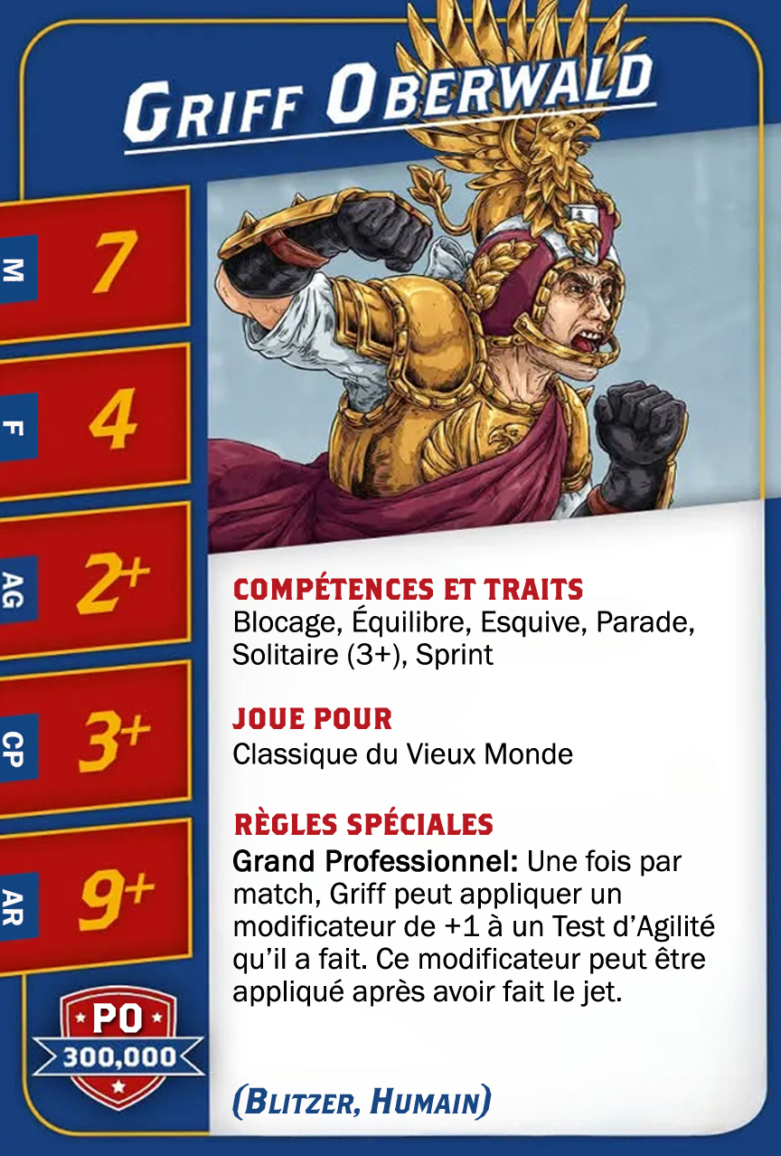 | 0-2 | Bretonnian Knight Catcher (Humain, Receveur) | 85,000 | 7 | 3 | 3+ | 4+ | 9+ | Intrépide, Nerfs d’Acier, Réception | AG | S | 8,9 |