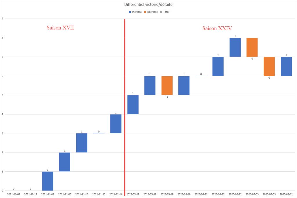 Les Admirats ont terminés les deux saisons à la 6ième position globalement. Donc ils n’ont pas amélioré leur performance mais ils ne l’ont pas empiré non plus. Ils finissent avec un bilan positif à +7 avec 10 victoires, 4 nulles et 3 défaites en 17 matchs. Ils ont 47 points au classement ELO pour la saison XVII et 46 points pour la saison XXIV.