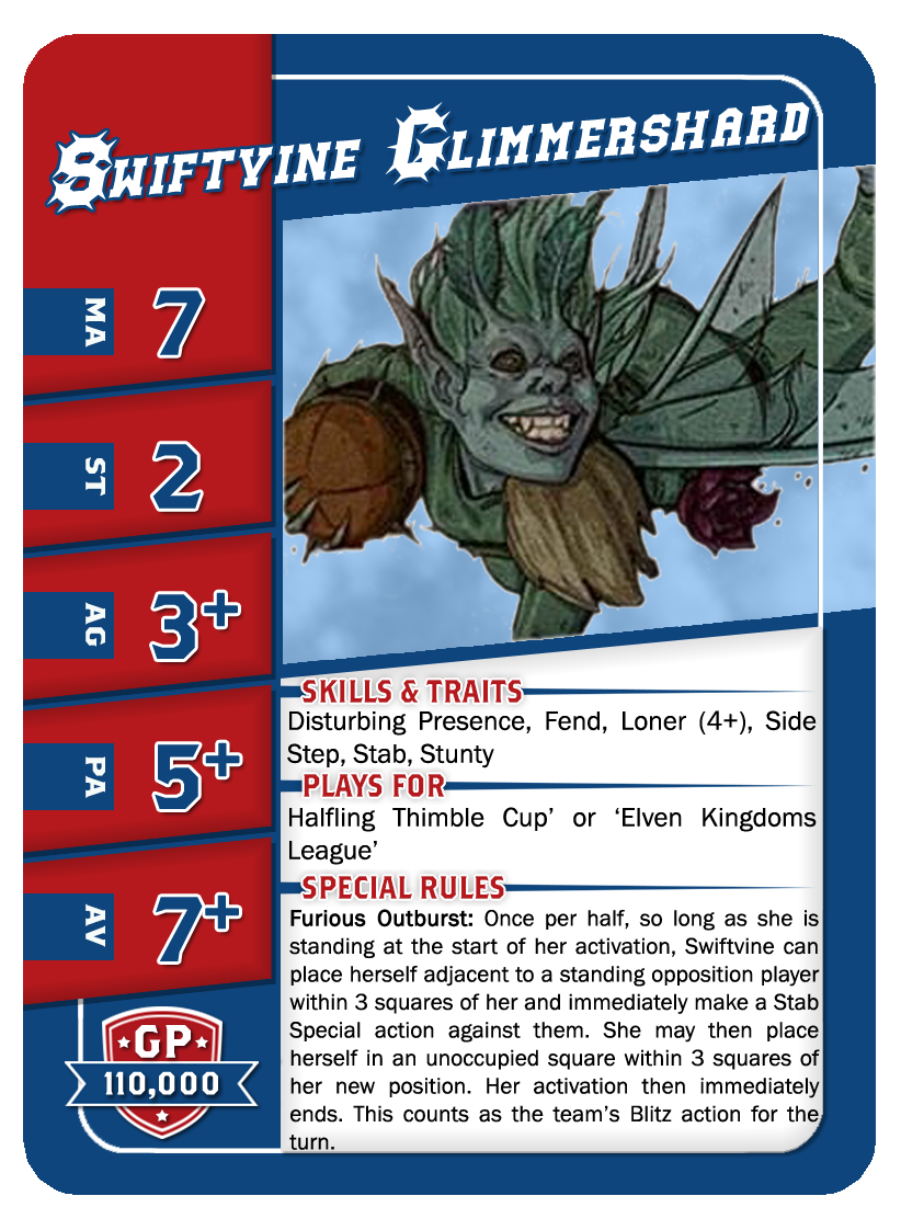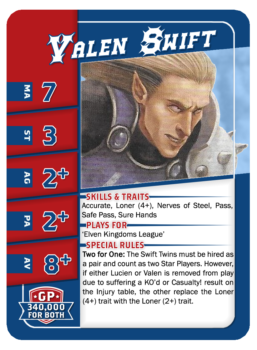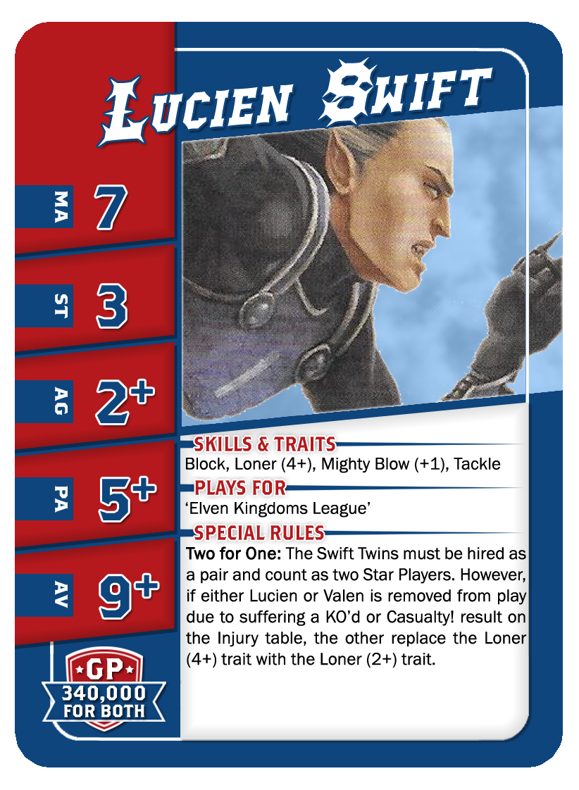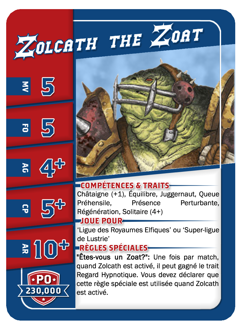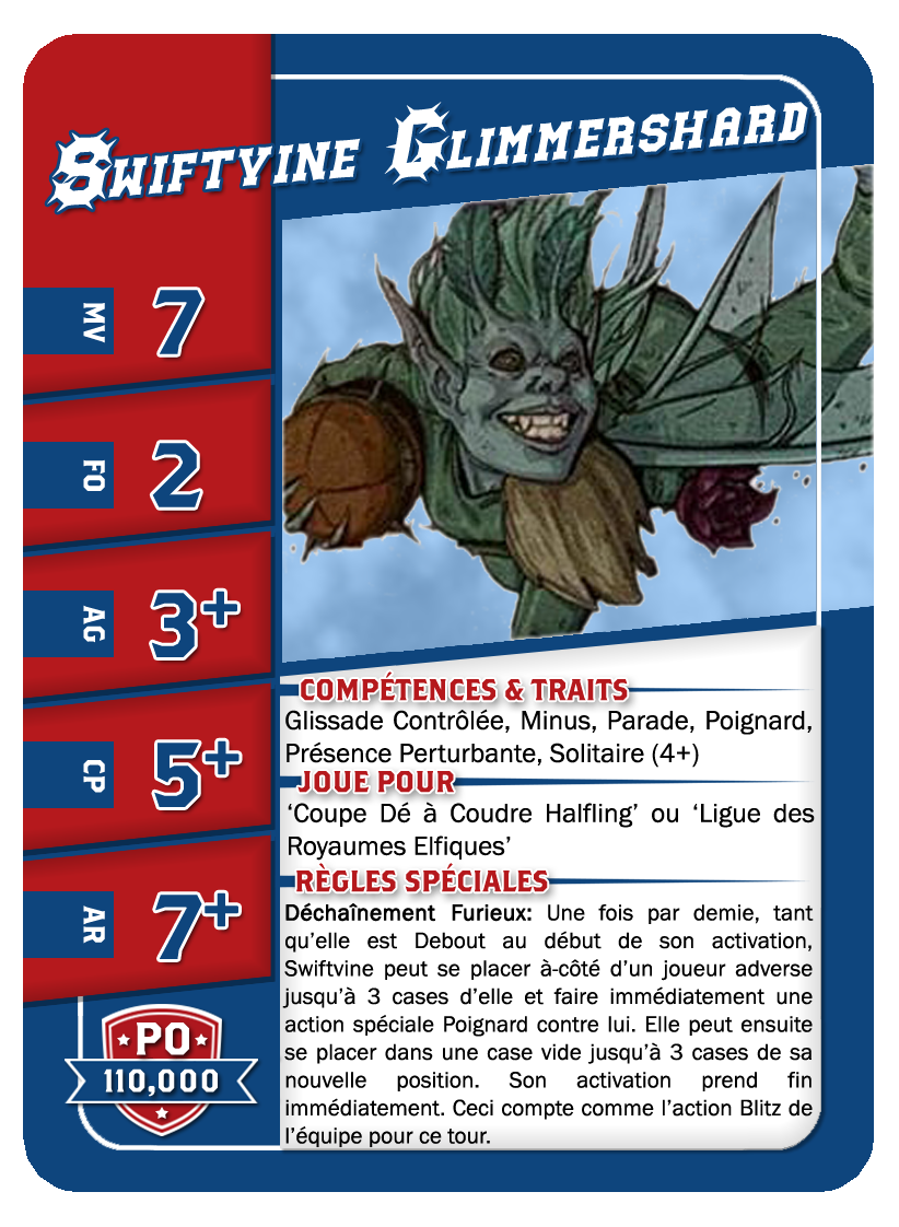 | 0-2 | Throwers | 100,000 | 6 | 3 | 2+ | 2+ | 9+ | Passe, Passe Assurée, Perce-Nuages | AGP | S | 10,11 | 4,5,6 |