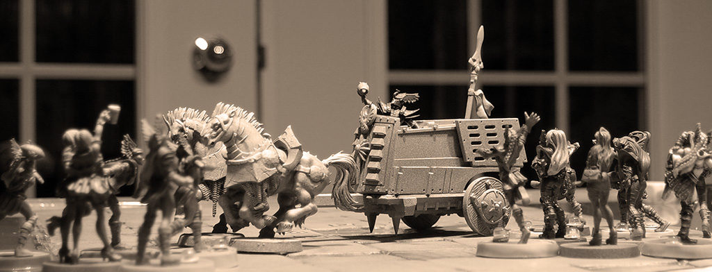 Le char officiel des Rapides est un mélange de technologie orque, chaotique, elfe et empire. Cette antiquité, rafistolée avec de la broche, a jadis remporté le rallye Pourris-Drakkar.