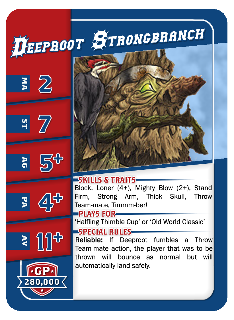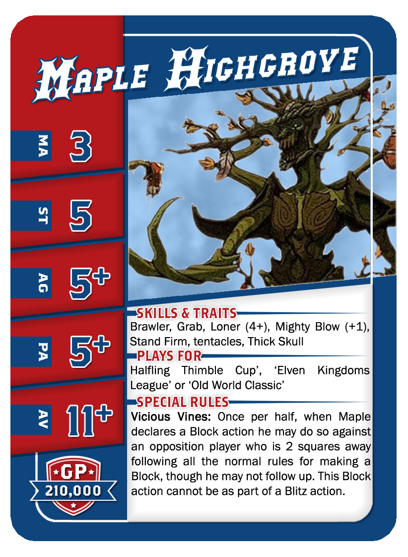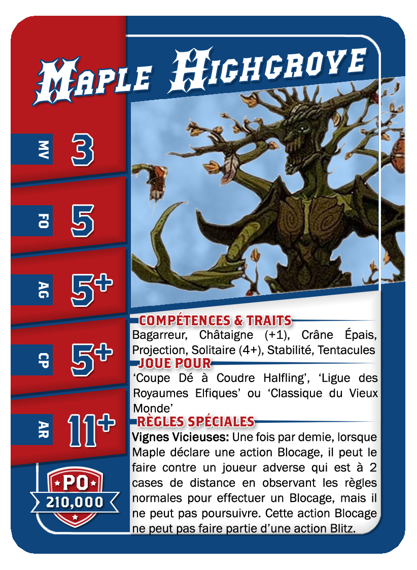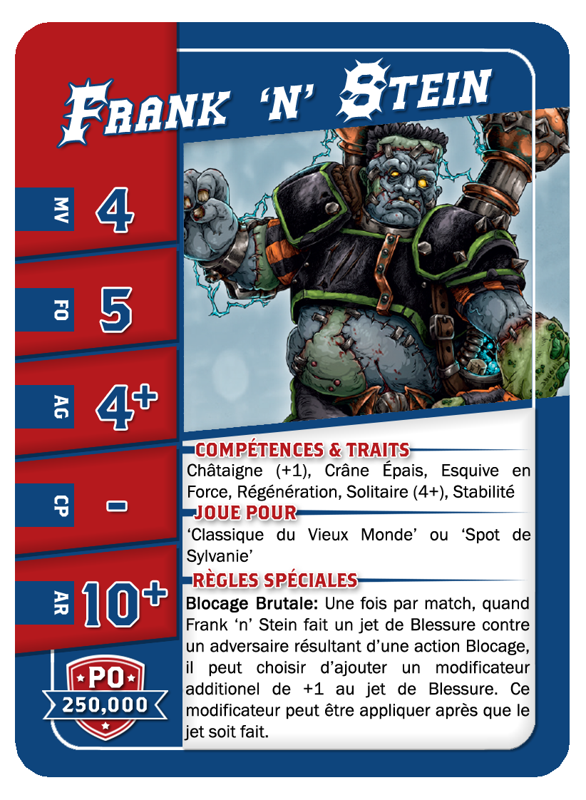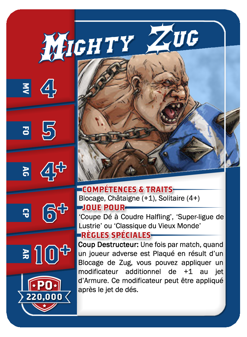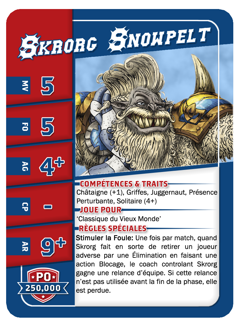 | 0-1 | Ogre | 140,000 | 5 | 5 | 4+ | 5+ | 10+ | Châtaigne (+1), Cerveau Lent, Crâne Épais, Lancer de Coéquipier, Solitaire (4+), | S | AG | 11 |