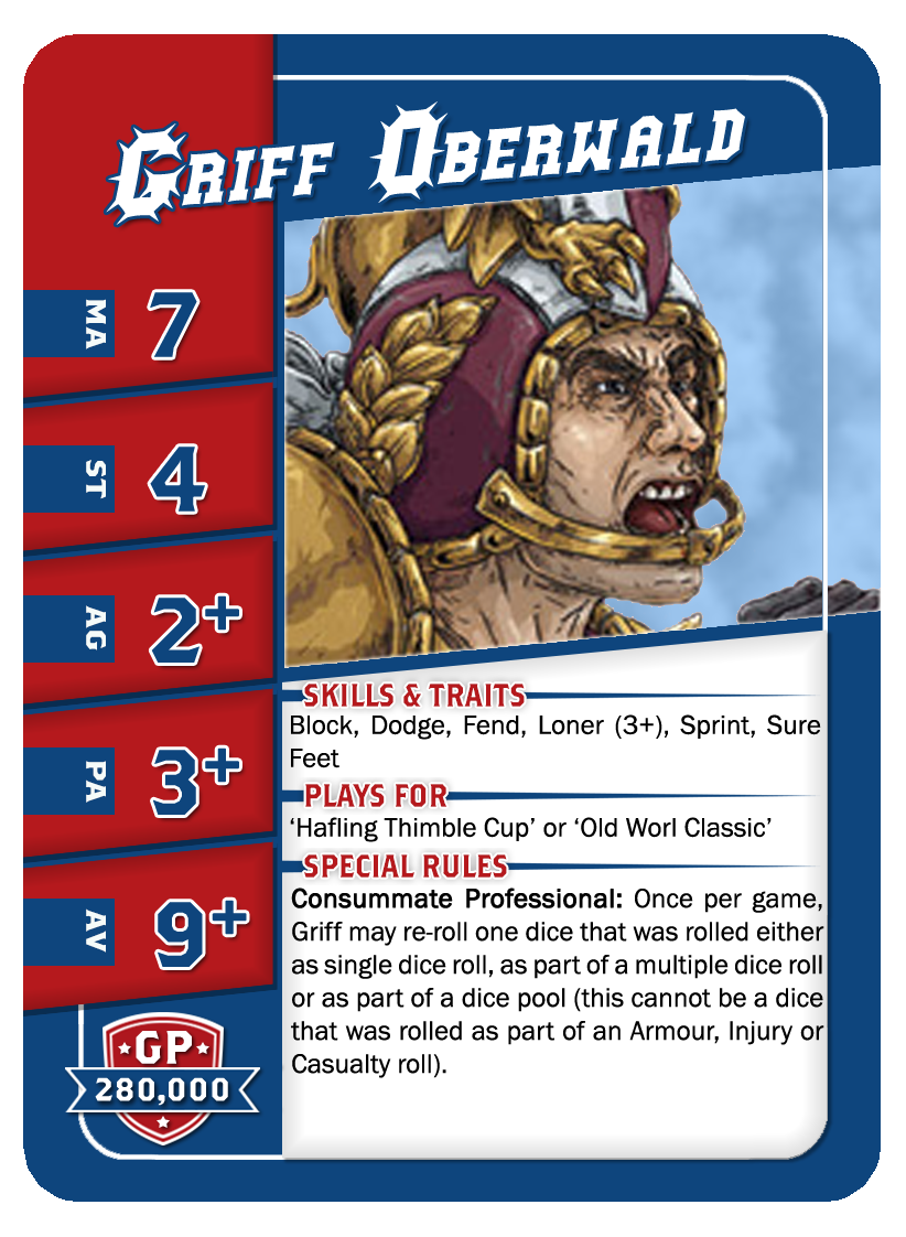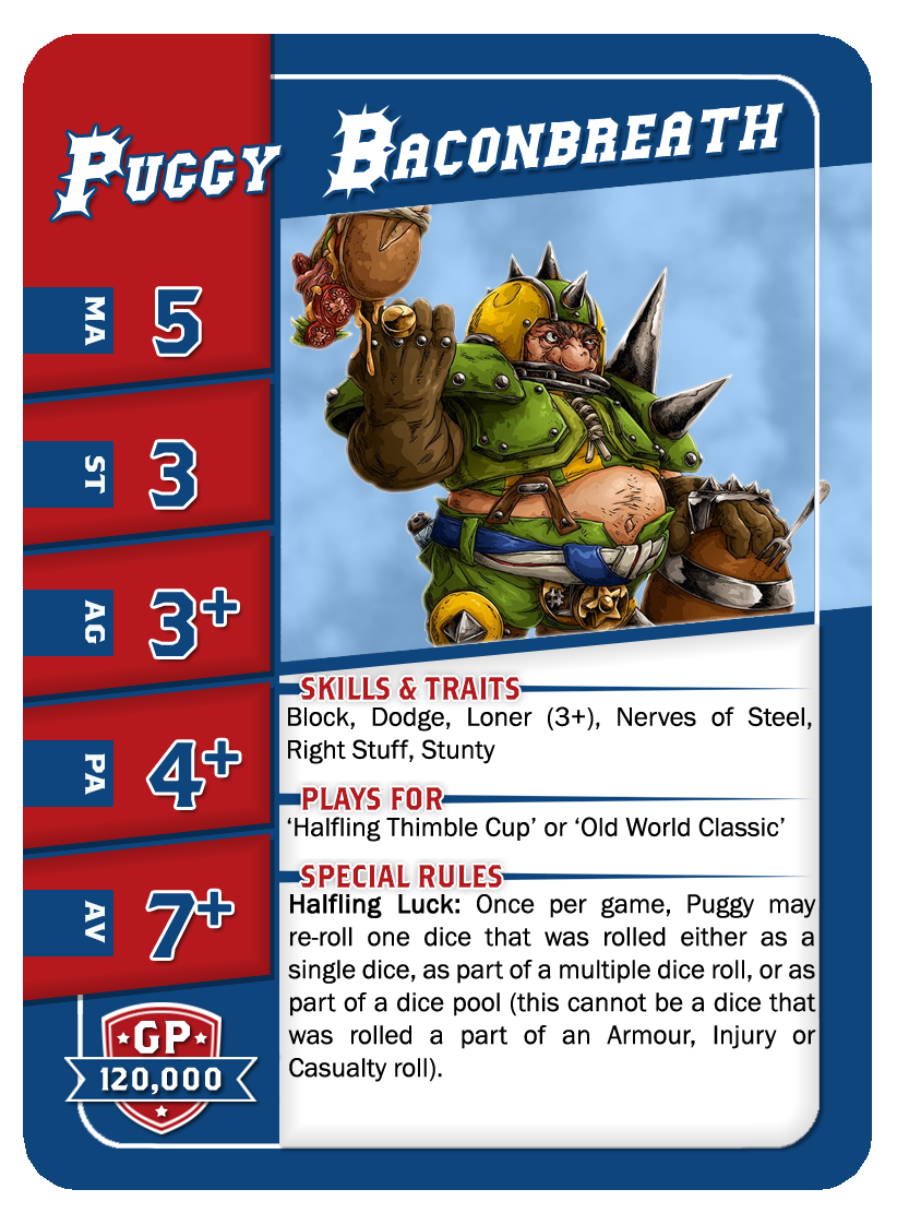 | 0-3 | Halfling Hopefuls | 30,000 | 5 | 2 | 3+ | 4+ | 7+ | Esquive, Minus, Poids Plus | A | GS | 7,8 | 9,10 |