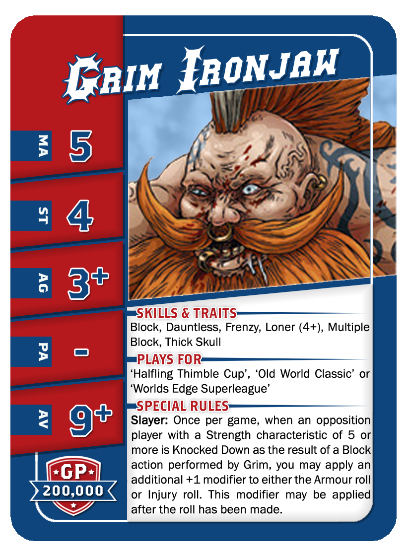 | 0-4 | Blitzers | 85,000 | 7 | 3 | 3+ | 4+ | 9+ | Blocage | GS | AP | 5,6 | 7,8 |