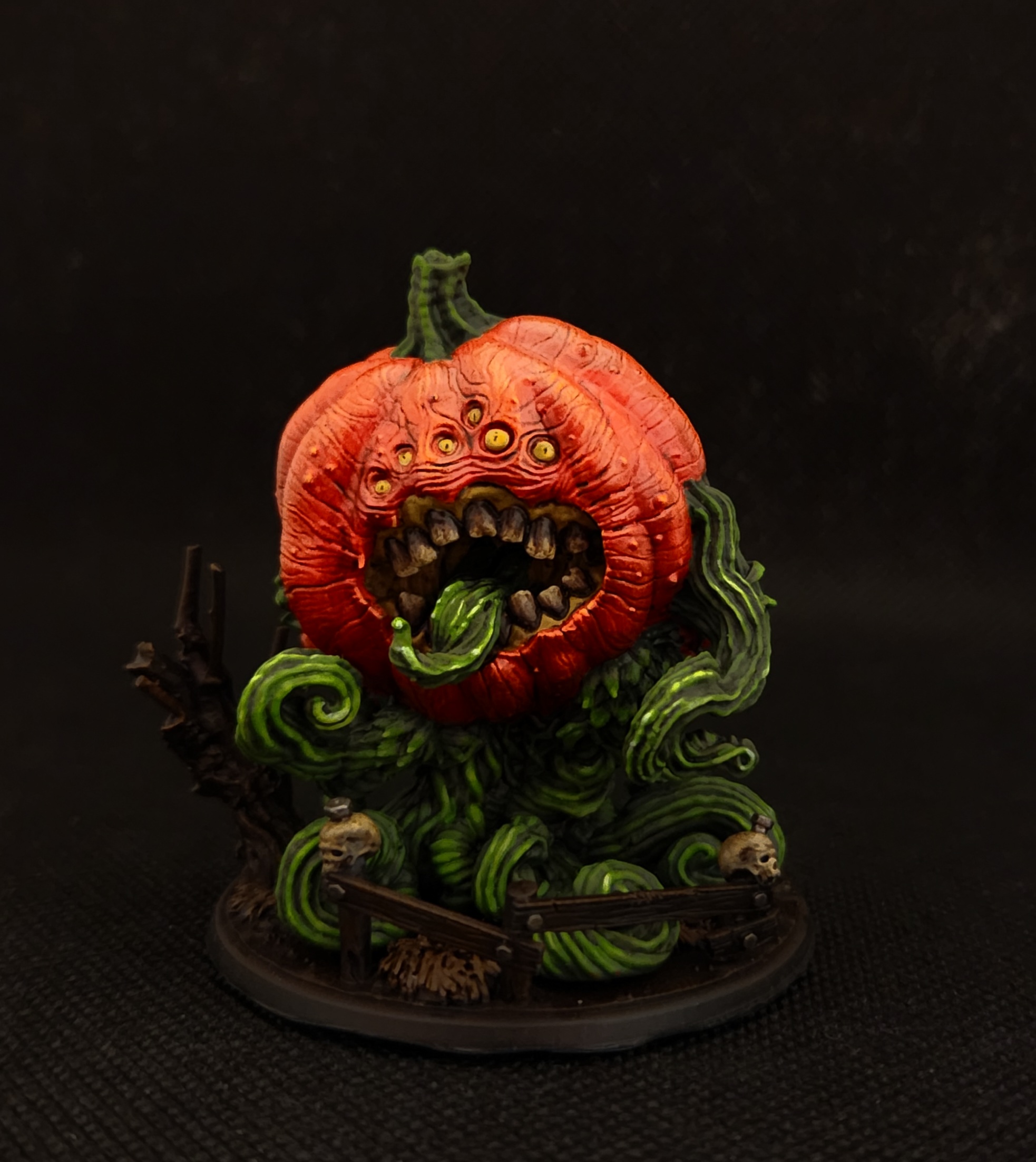 Il murmure une incantation dans la langue nécromantique. La citrouille commence à prendre vie. Elle se fait soulever par ses racines. Celles-ci semblent invraisemblablement lui servir de membres. Une fissure horizontale s’agrandit et crée une bouche. On peut y découvrir ses dents à moitié pourries ainsi qu’une langue verte identique à ses racines. Au dessus de sa bouche, de multiples poques disparaissent pour y laisser place à des yeux jaunes foncés qui regardent dans différentes directions.