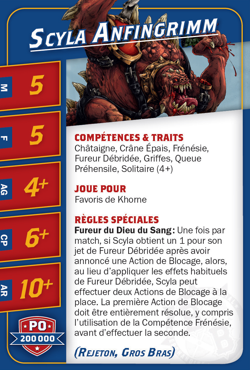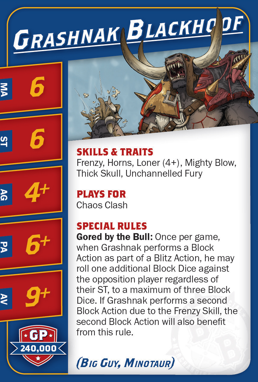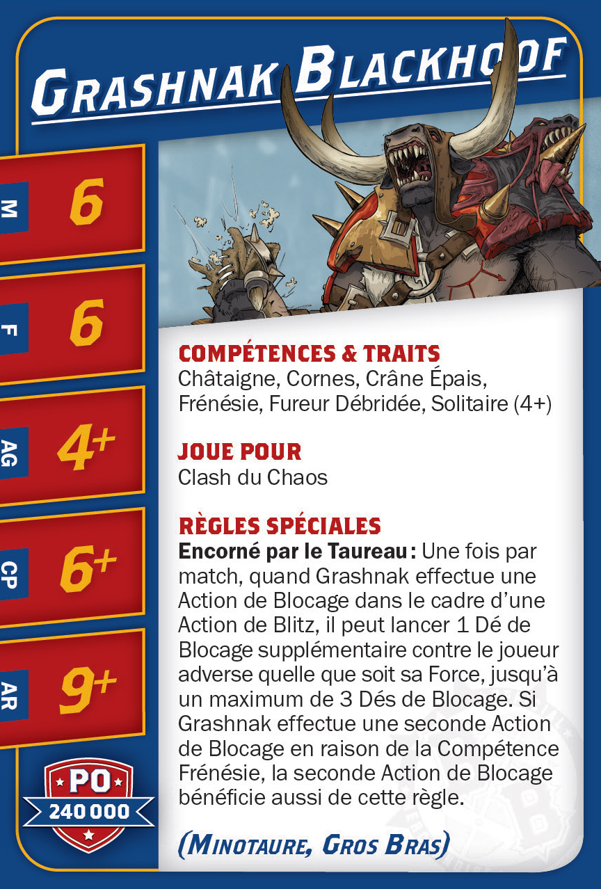 | 0-1 | Minotaur (Gros Bras, Minotaure) | 150,000 | 5 | 5 | 4+ | 6+ | 9+ | Châtaigne, Cornes, Crâne Épais, Frénésie, Fureur Débridée, Solitaire (4+) | MS | AG | 11 |