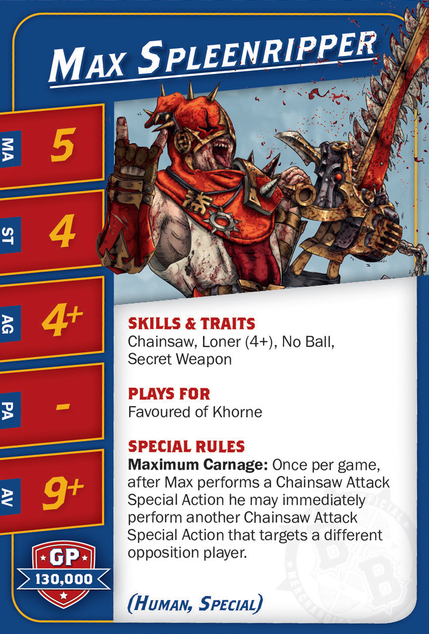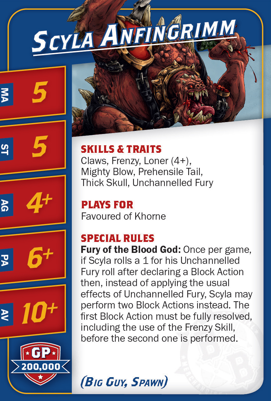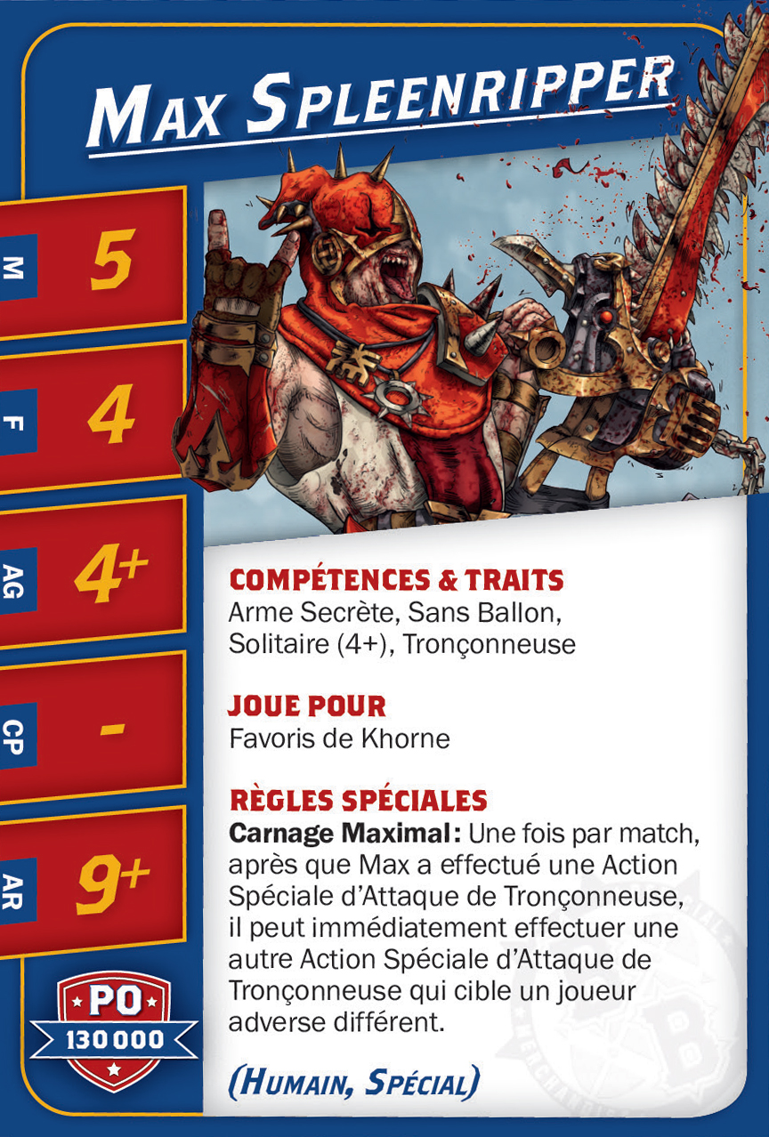| 0-1 | Minotaur (Gros Bras, Minotaure) | 150,000 | 5 | 5 | 4+ | 6+ | 9+ | Châtaigne, Cornes, Crâne Épais, Frénésie, Fureur Débridée, Solitaire (4+) | MS | AG | 11 |