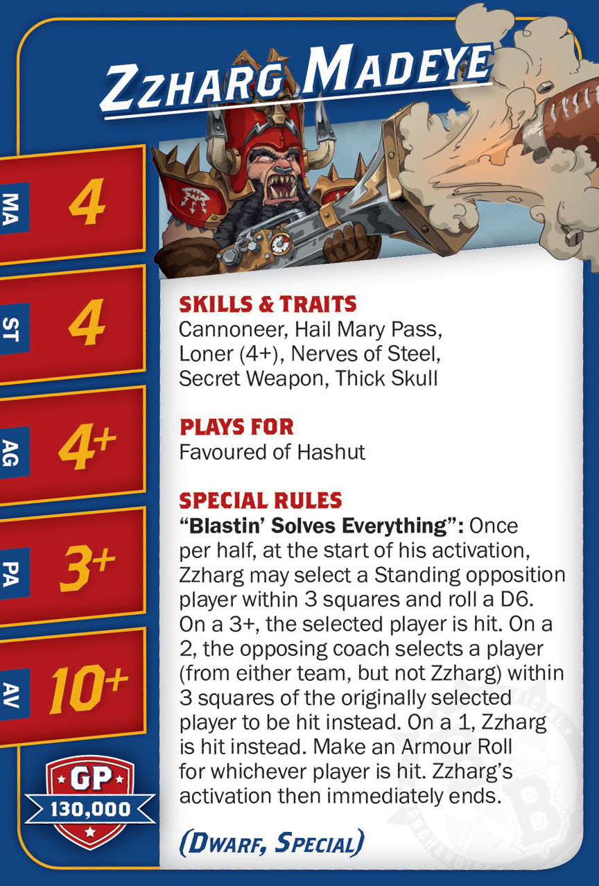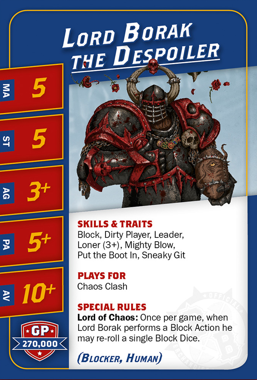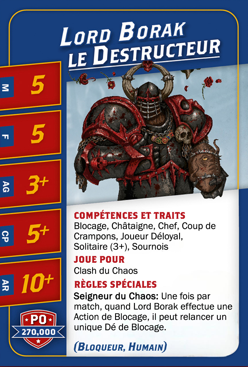 | 0-2 | Chaos Dwarf Blocker (Bloqueur, Nain) | 70,000 | 4 | 3 | 4+ | 6+ | 10+ | Blocage, Crâne Épais, Peau de Fer | GS | ADM | 5,6 |
