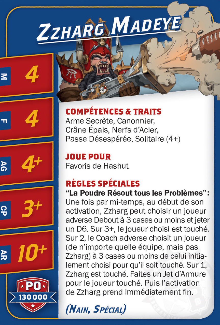| 0-2 | Bull Centaur (Blitzer, Nain) | 130,000 | 6 | 4 | 4+ | 6+ | 10+ | Crâne Épais, Équilibre, Instable, Sprint | GS | ADM | 9,10 |