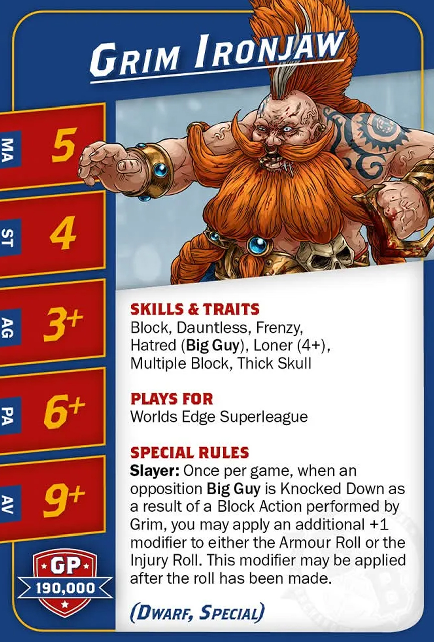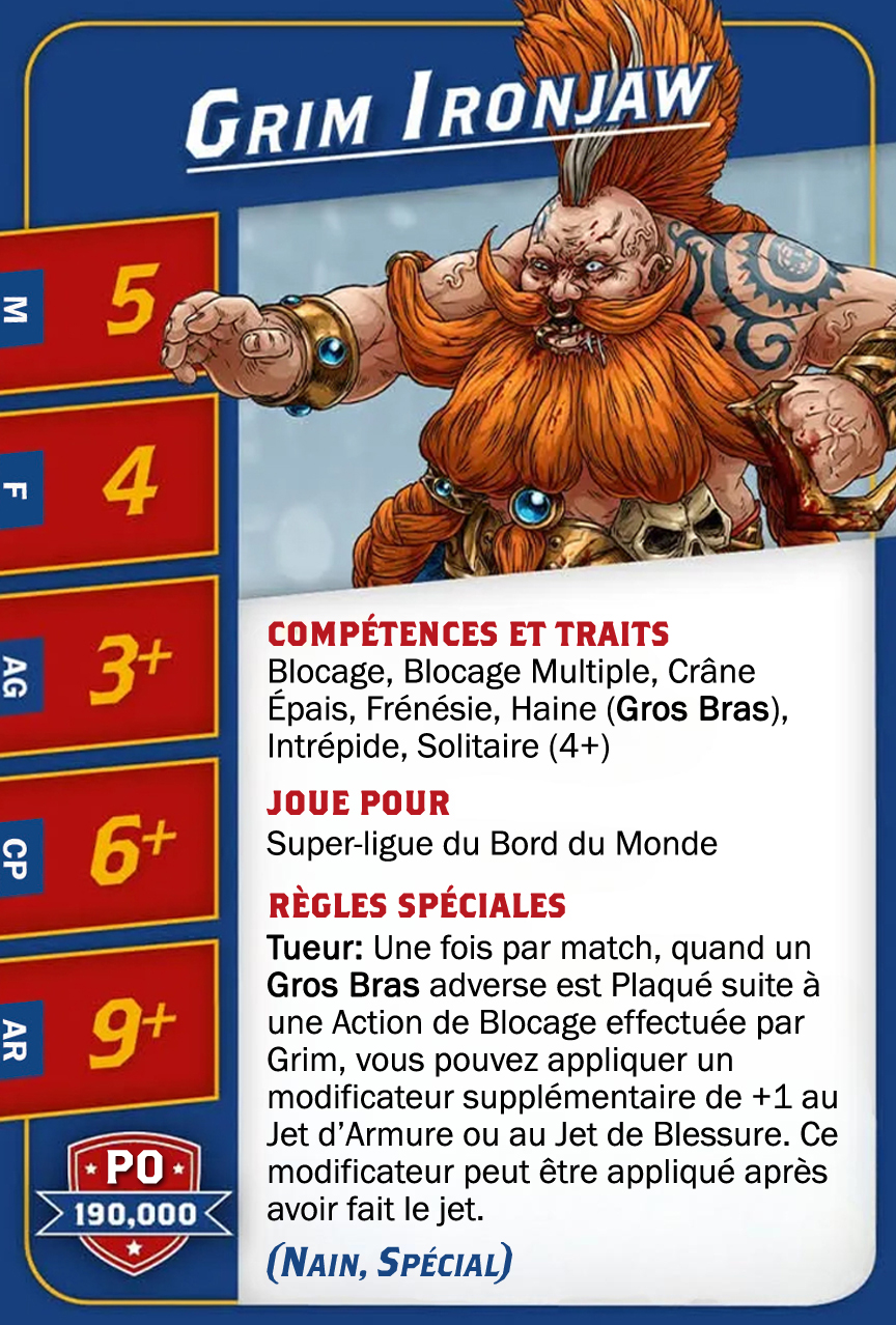 | 0-1 | Ogre Runt Punter (Gros Bras, Lanceur, Ogre) | 145,000 | 5 | 5 | 4+ | 4+ | 10+ | Botter de Coéquipier, Cerveau Lent, Châtaigne, Crâne Épais | PS | ADG | 10,11 |