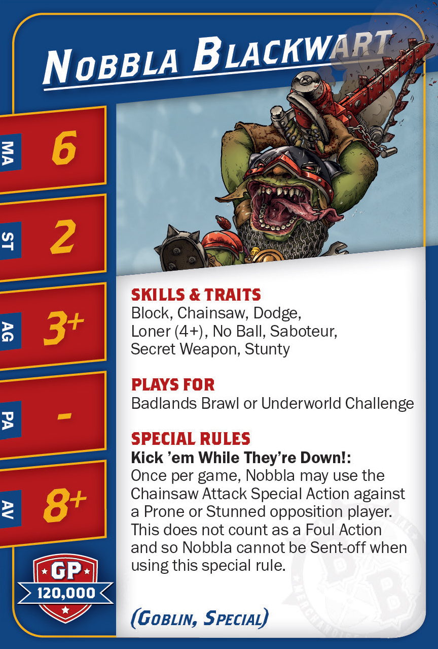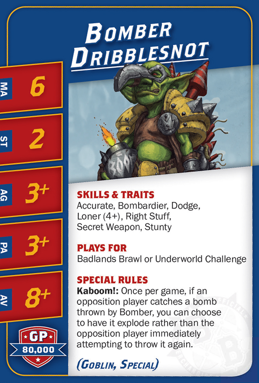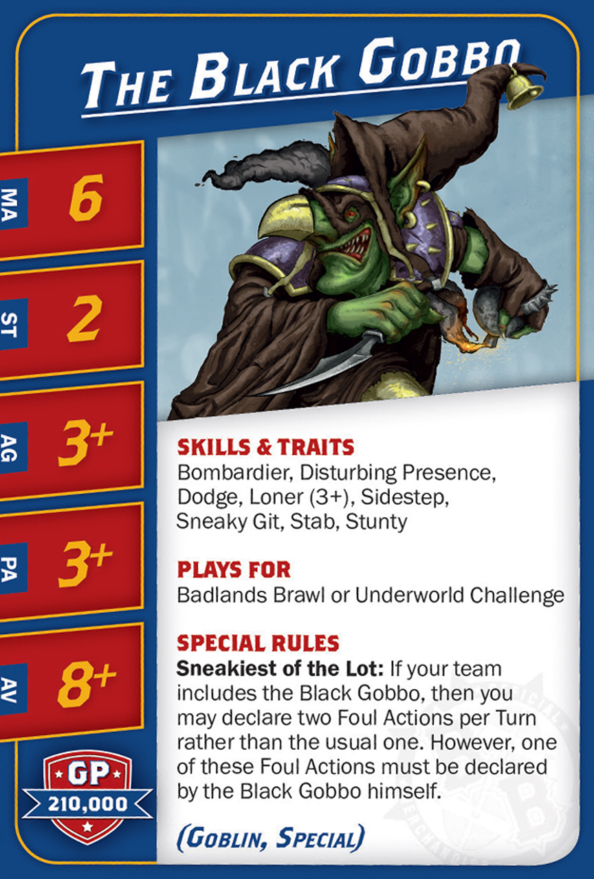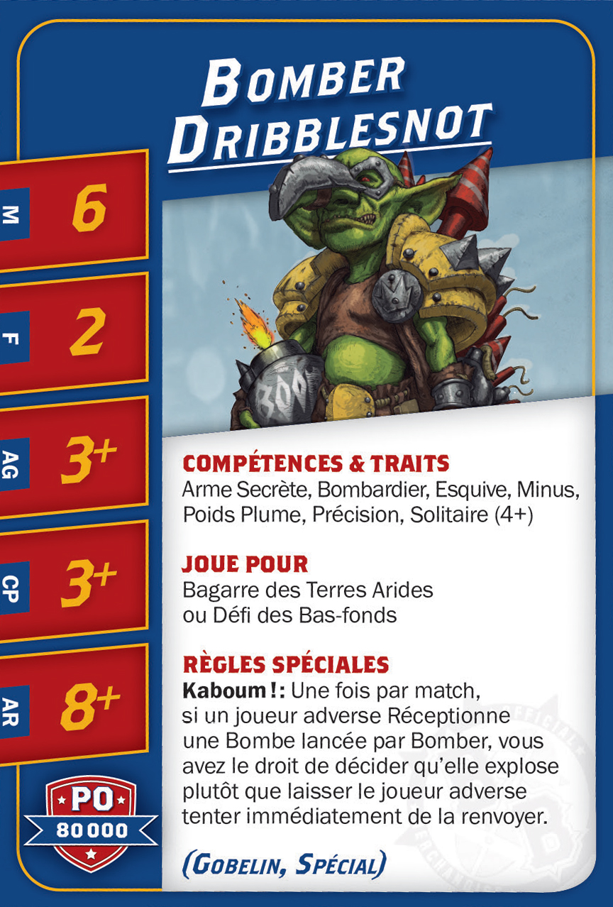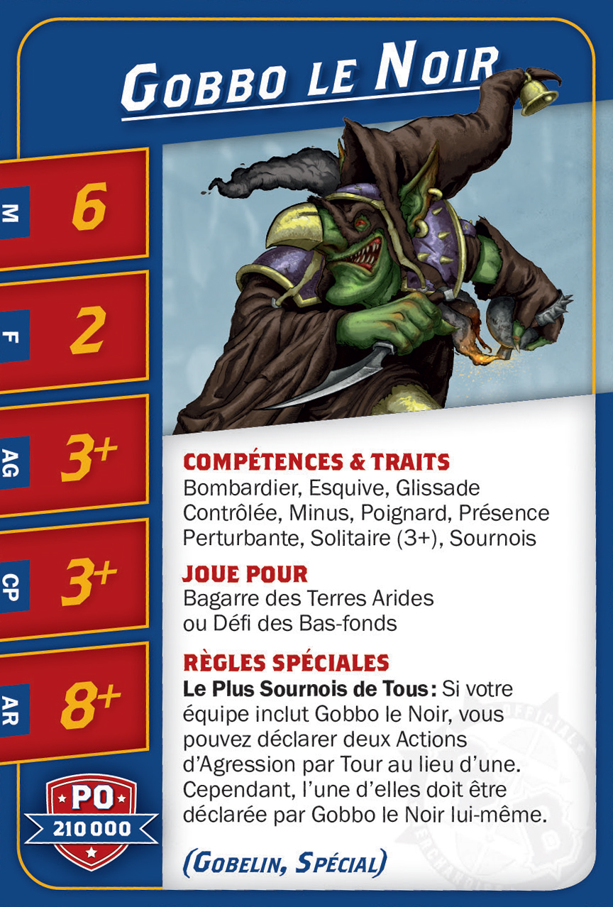 | 0-16 | Goblin Bruiser (Gobelin, Trois-quart) | 45,000 | 6 | 2 | 3+ | 4+ | 8+ | Crâne Épais, Esquive, Minus, Poids Plume | AD | GPS | 1,2,3,4,5 |