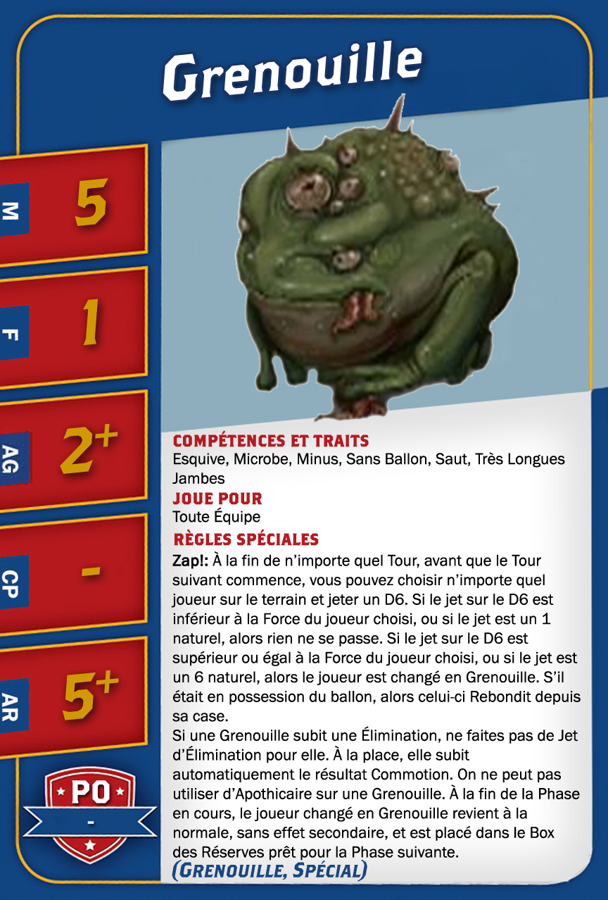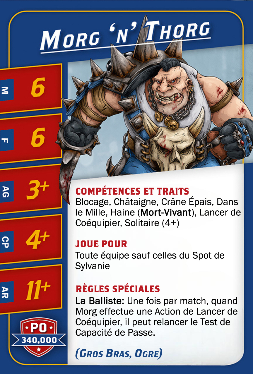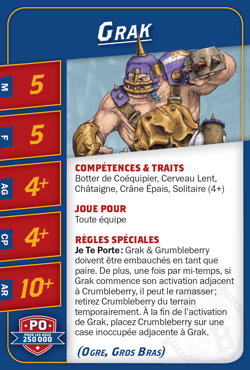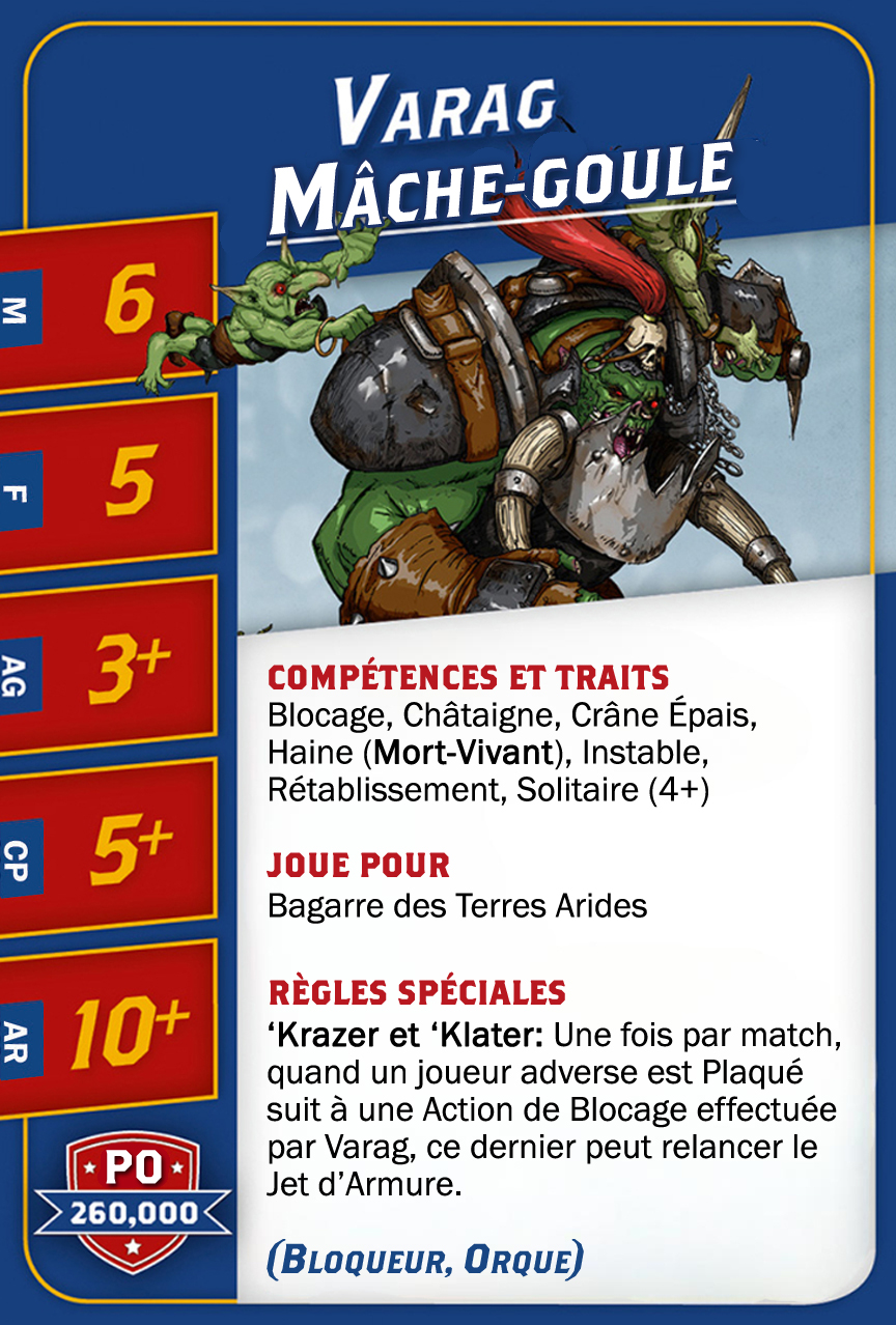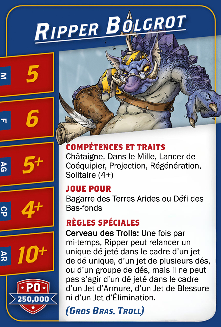 | 0-1 | Trained Troll (Gros Bras, Troll) | 115,000 | 4 | 5 | 5+ | 5+ | 10+ | Châtaigne, Gerbe de Vomi, Gros Débile, Lancer de Coéquipier, Régénération, Toujours Affamé | S | AGP | 10,11 |