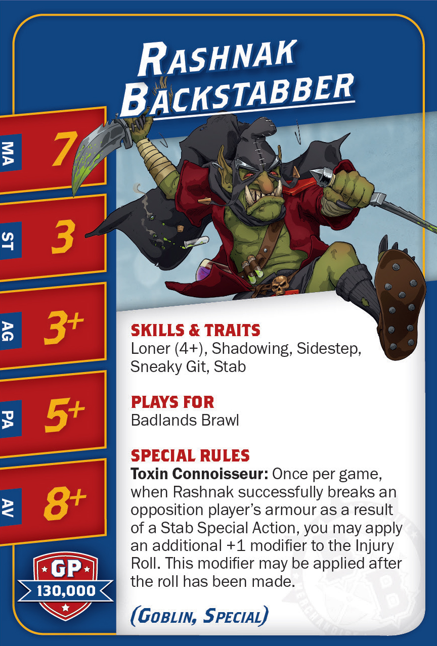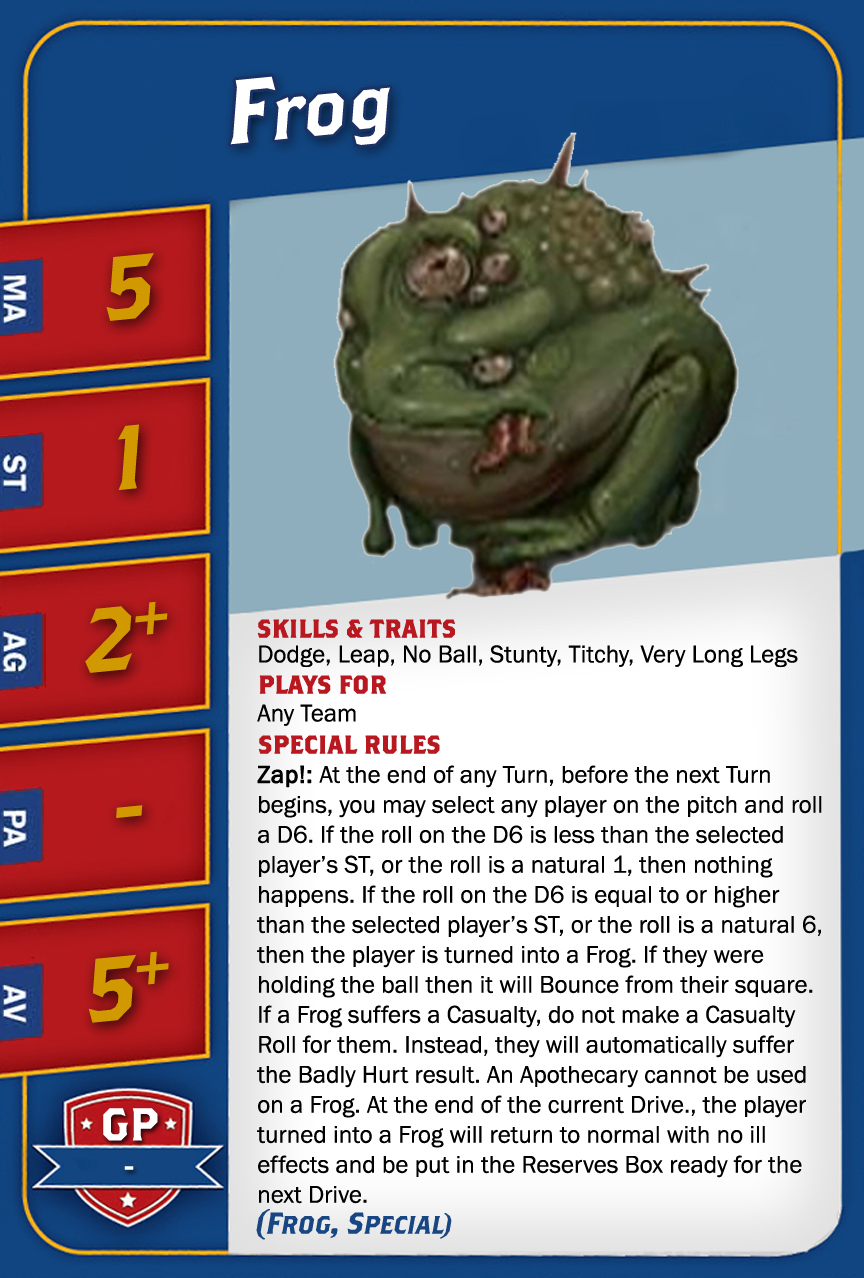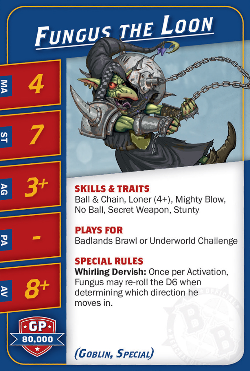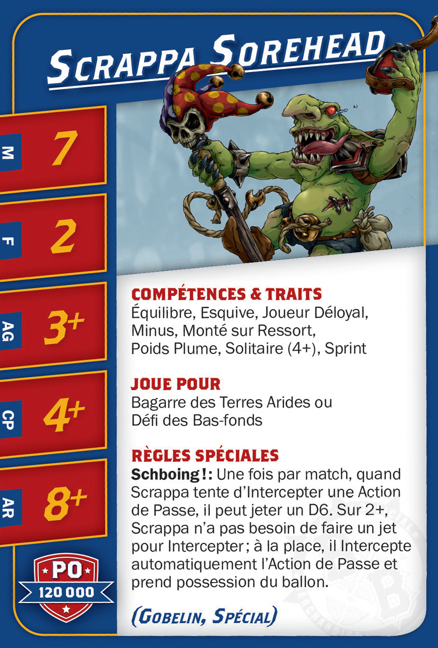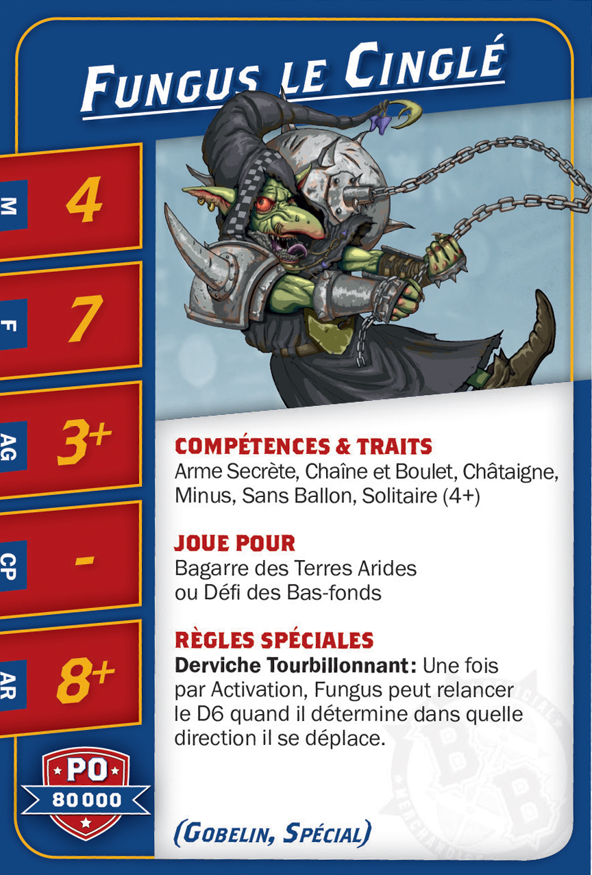 | 0-16 | Goblin Bruiser (Gobelin, Trois-quart) | 45,000 | 6 | 2 | 3+ | 4+ | 8+ | Crâne Épais, Esquive, Minus, Poids Plume | AD | GPS | 1,2,3,4,5,6,7,8 |