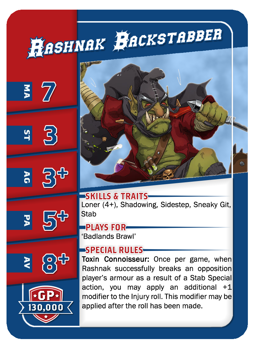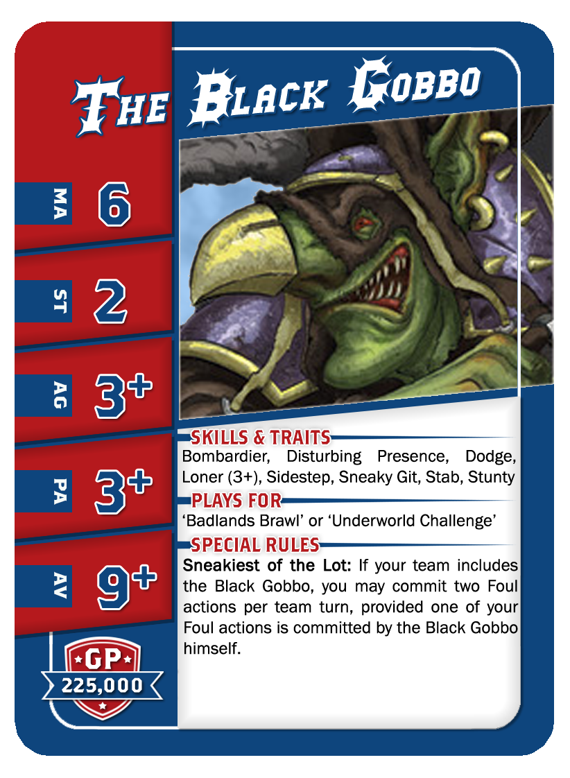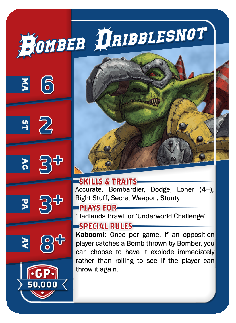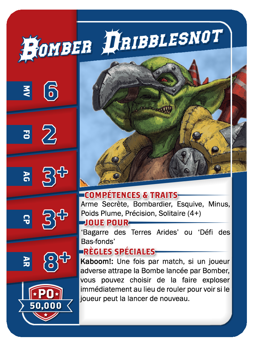 | 0-12 | Goblin Bruiser Linemen | 45,000 | 6 | 2 | 3+ | 4+ | 8+ | Crâne Épais, Esquive, Minus, Poids Plume | A | GPS | 1,2,3,4,5,6 |
