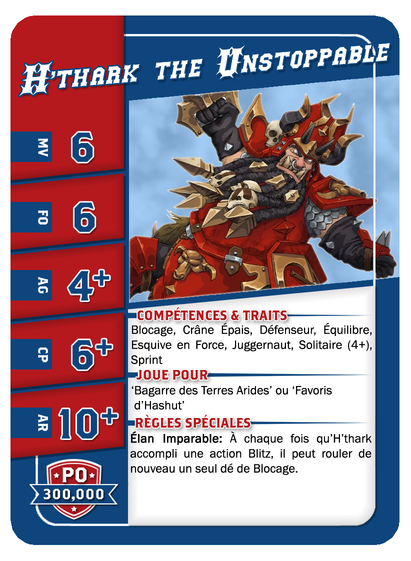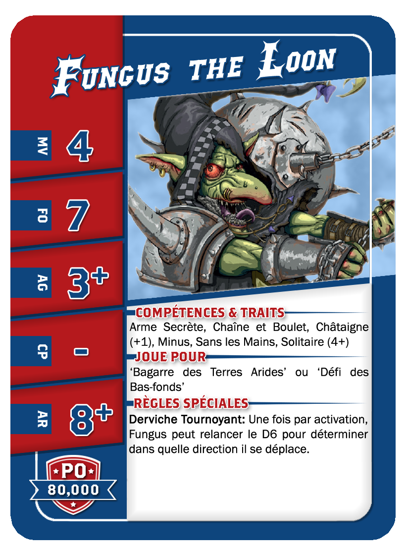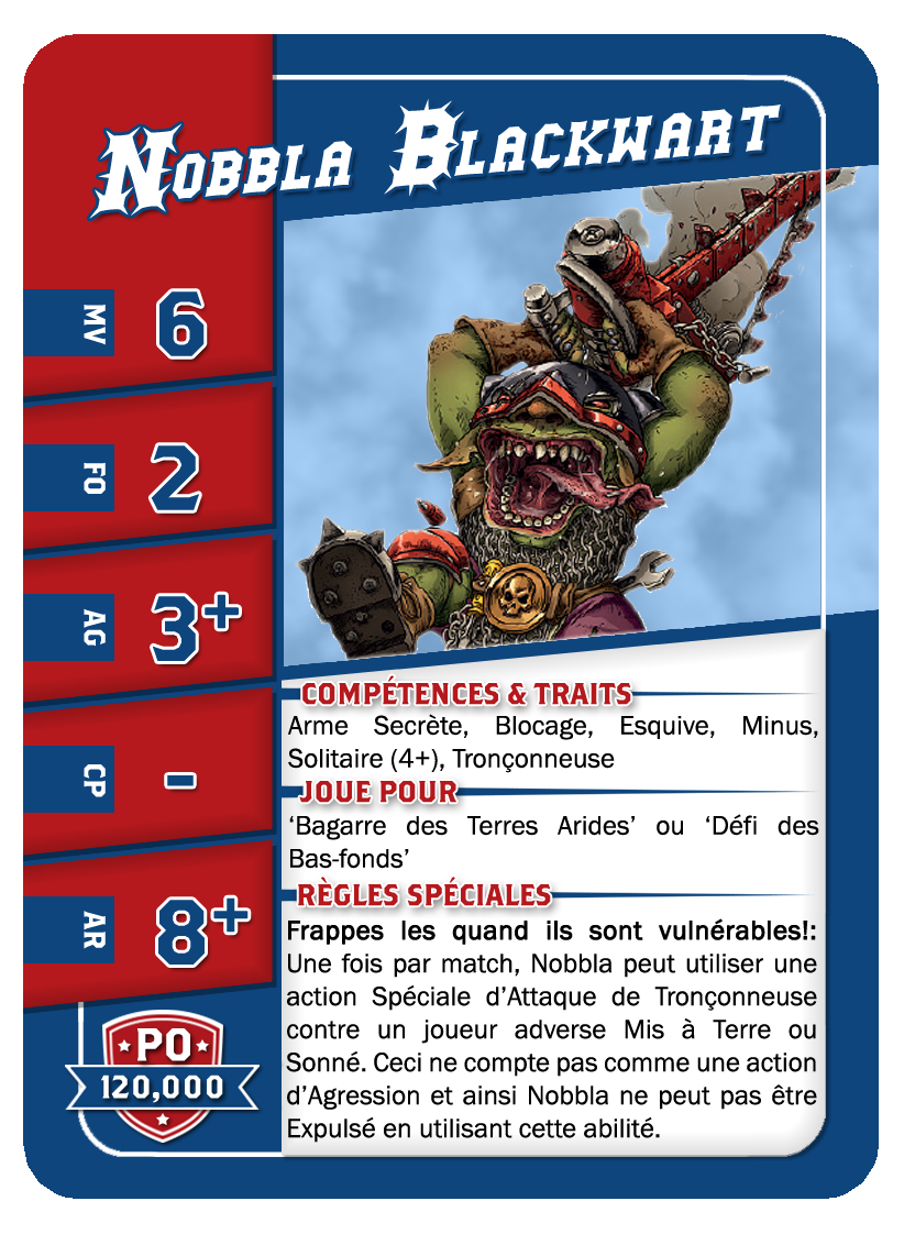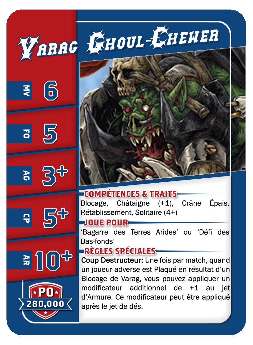 | 0-1 | Trained Trolls | 115,000 | 4 | 5 | 5+ | 5+ | 10+ | Châtaigne (+1), Gerbe de Vomi, Gros Débile, Lancer de Coéquipier, Régénération, Solitaire (3+), Toujours Affamé | S | AGP | 7,8,9,10,11 |