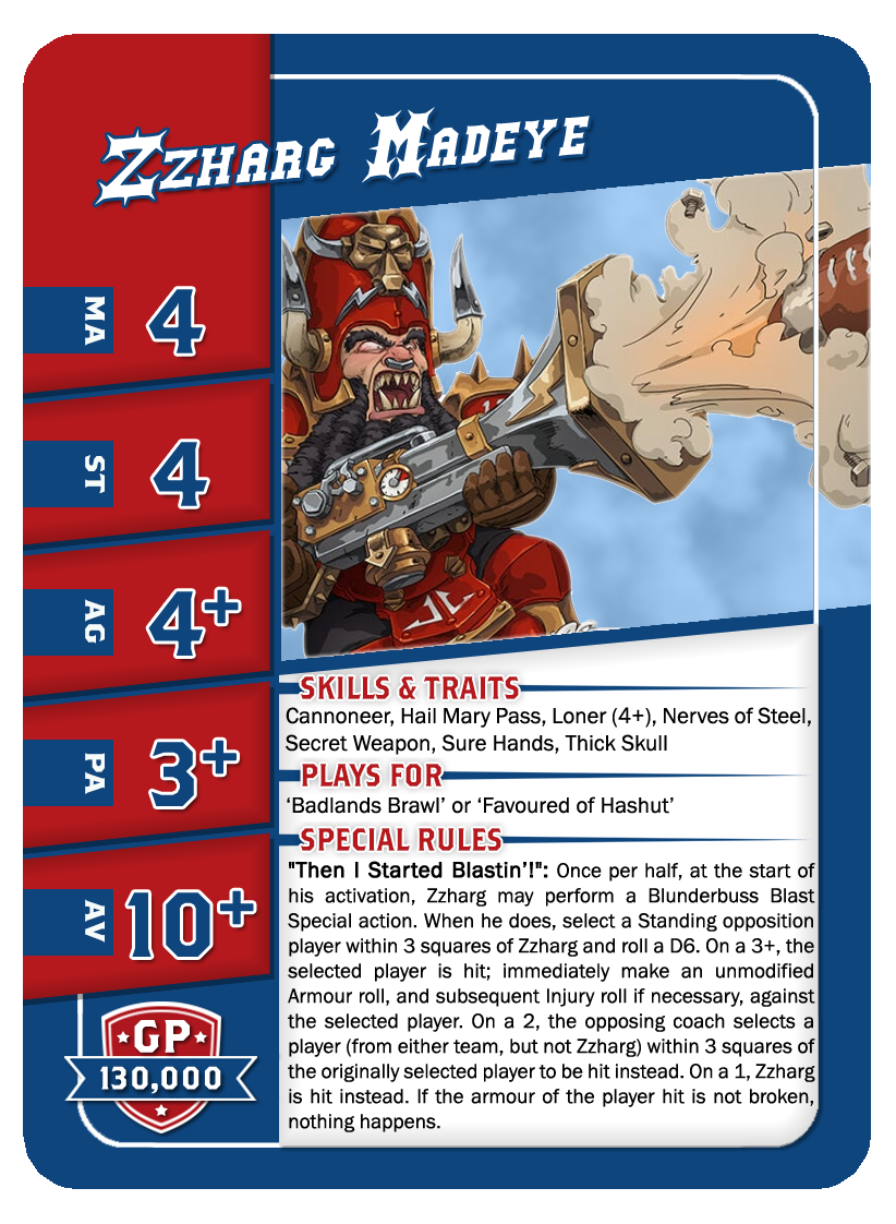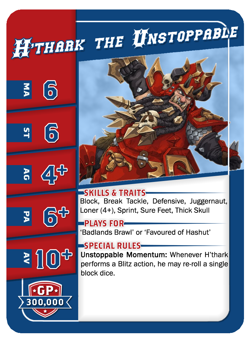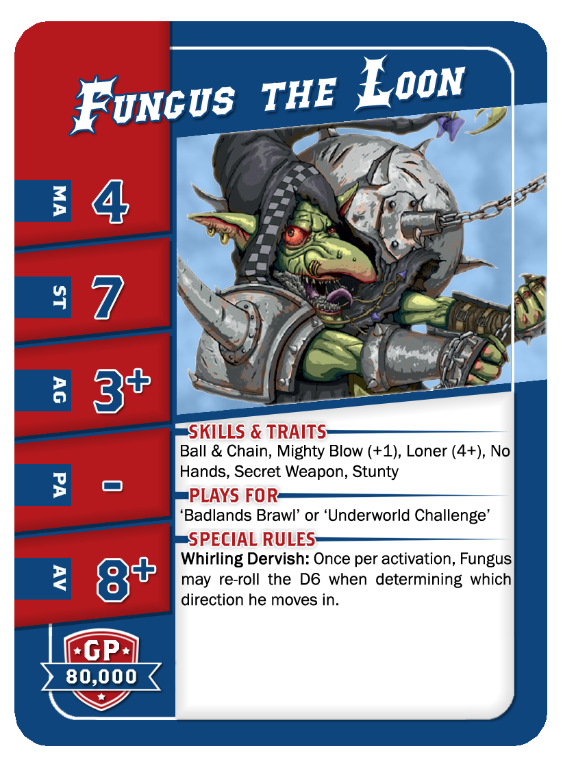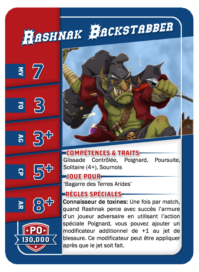 | 0-1 | Trained Trolls | 115,000 | 4 | 5 | 5+ | 5+ | 10+ | Châtaigne (+1), Gerbe de Vomi, Gros Débile, Lancer de Coéquipier, Régénération, Solitaire (3+), Toujours Affamé | S | AGP | 7,8,9,10,11 |