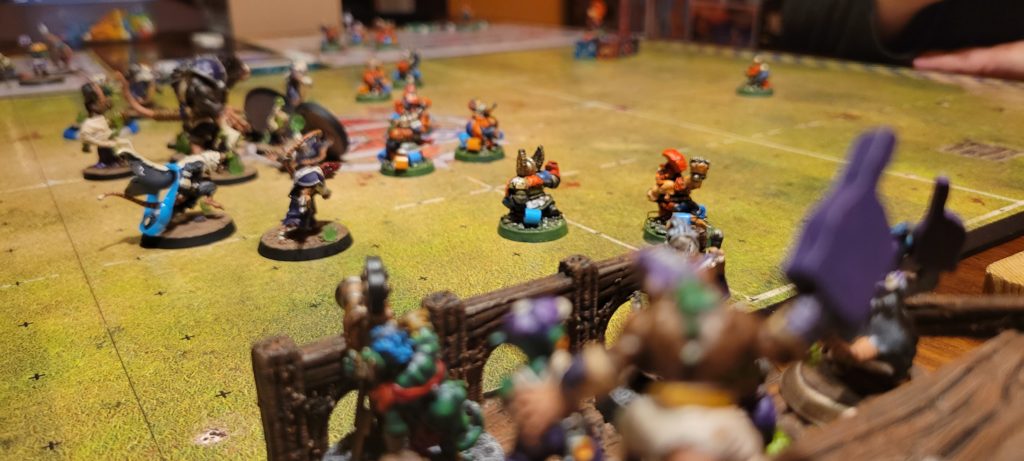 Les nains des Barbelés reçoivent le ballon, et malgré les beaux efforts du blitzer Waltik Cragborn, la balle passe des mains du Runner Boulon au lineman Teflon de retour a Boulon pour le touché, laissant une trail de mineurs KO au plancher. Heureusement ceux-ci retourne au combat après la demie. Kudos au travail d’équipe des Warpentiers qui, ensemble, piétinères 2 linemen nains, les envoyant à l’infirmerie. Cette avantage numérique se prouva crucial pour le reste de la partie.