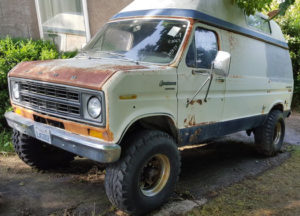Eustache conduit le camion de l’équipe. Econoline E350 Pathfinder Quadravan 1977.