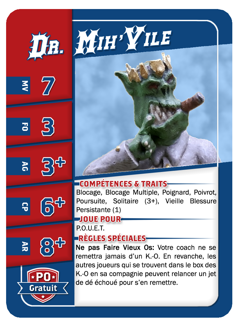 | 1 | Maréchal Mhurg | - | - | 175K | Châtaigne (+1), Gerbe de Vomi, Gros Débile, Lancer de Coéquipier, Régénération, Solitaire (3+), Toujours Affamé, Bras Musclé [6*], Blocage [14] | 18 | 0 | 7 | 12 | 0 | 0 | 0 | 31 |